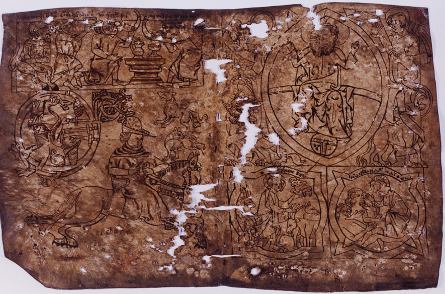 Auf der rechten Seite sieht man Christus in der Mitte als Erlöser der Welt. Um ihn herum sind die Zeichen für die vier Evangelisten: Stier, Löwe, Adler und ein Mensch mit Flügeln/Engel. Christus hat einen Heiligenschein und sitzt dort mit der Welt zu seinen Füßen. Darunter sind das fünfte und das siebte Bild der Entstehungsgeschichte der Welt abgebildet; auf dem ersten erschafft Gott die Tiere, darüber steht: „Hér öll ferfætt dýr“ („Hier alle vierbeinigen Tiere“), auf dem zweiten erschafft er die Menschen, Adam und Eva, und darüber steht: „Hér er skapaður Adam og Eva“ („Hier werden Adam und Eva erschaffen“). Auf dem Bild sieht man, in welch schlechtem Zustand und wie vermodert das Pergament an vielen Stellen in der Teiknibók ist.