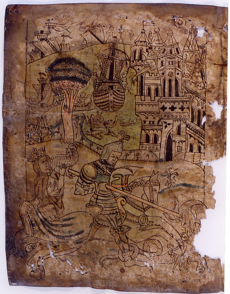 Diese Zeichnung stammt nicht aus dem ältesten Teil der Teiknibók AM 673a III 4to. Sie gleicht einem Gemälde, da sie jemand nachträglich farbig ausgemalt hat. Die Legende vom Heiligen Georg erzählt von einem bösartigen Drachen, der sich im Sumpf nahe der Stadt Kampedus niedergelassen hat. Täglich begab sich der Drache zur Stadt auf der Suche nach Nahrung und die Stadtbewohner mussten jedes Mal ein Menschenopfer bringen. Sie losten die Opfer aus und eines Tages fiel das Los auf die liebliche Königstochter Kleolinda. Der mutige Ritter Georg konnte den Gedanken nicht ertragen, dass Kleolinda Opfer des Drachens werden sollte und rettete sie im letzten Moment, indem er den Drachen aufspießte. Er überbrachte den Stadtbewohnern den Kadaver, diese priesen Gott und viele von ihnen ließen sich taufen – in einer überwiegend heidnischen Zeit. Vorne im Bild sitzt Georg mit Rüstung und Helm bekleidet und mit einem Schild in der Hand auf seinem Pferd und spießt den Drachen auf. Hinter ihm steht die Königstochter mit Krone und langem Haar und sieht zu. Ihre Eltern, das Königspaar, sieht man in der Ferne auf dem Balkon des Palastes. Ein Schaf steht auf der Weide und in der Ferne sieht man ein Schiff auf dem Meer.