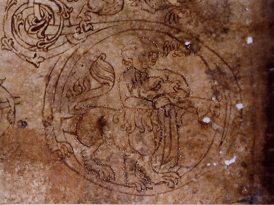 Ein Hirte rettet ein Lamm aus dem Maul des Löwen auf einer Seite der Teiknibók AM 673a III 4to. Man kann deutlich sehen, dass Löcher in das Pergament um das Bild herum gestochen worden sind, um dessen Umrisse zu markieren, die man dann als Anhaltspunkte für ein neues Bild nutzen konnte. Dies war vermutlich eine Vorlage für eine Bildinitiale, wahrscheinlich für den Buchstaben d. Es handelt sich hierbei um einen Teil eines Blattes, auf dem sich noch weitere Zeichnungen befinden.
